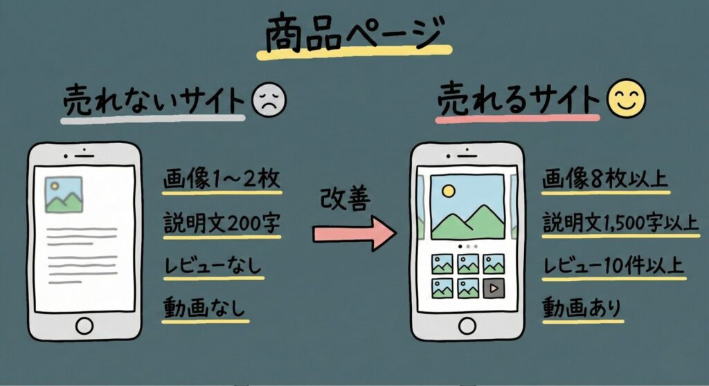 まずは売れ筋商品(または売りたい商品)の商品ページ改善から。画像と説明文の充実が最優先です。