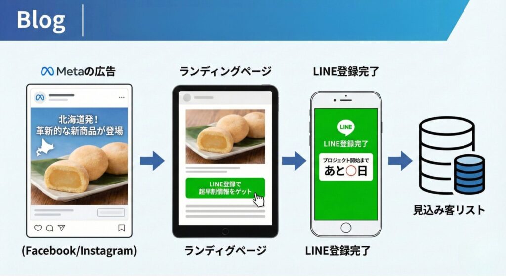 具体的には、プロジェクト開始の2週間〜1ヶ月前から、「北海道発の革新的な新商品が間もなく登場」という内容のティザー広告を配信します。広告の飛び先(LP)では、商品の魅力を簡潔に伝えつつ、「LINE登録で最大○%OFFの超早割情報をゲット」といったオファーを提示し、LINEの友だち追加を促します。ここで獲得したリストに対して、公開直前にカウントダウン配信を行い、開始と同時に購入へ誘導するのです。