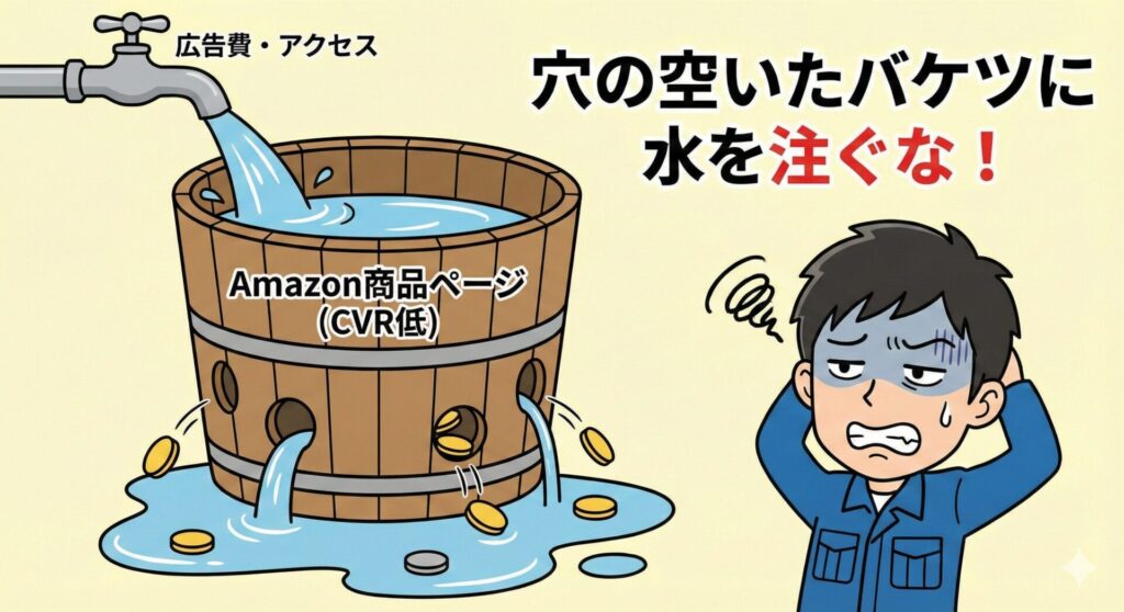 穴の空いたバケツに水を注いでも溜まらないように、商品ページ(カタログ)の「転換率(CVR)」が低い状態で広告を回しても、予算をドブに捨てるだけです。